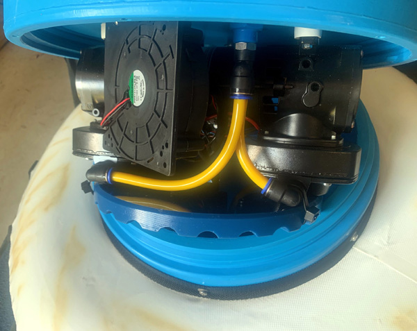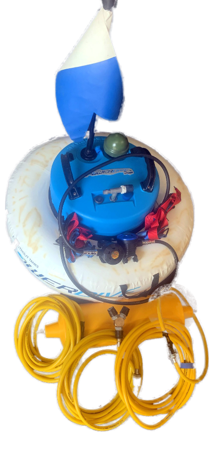 Latest model Powerdive PowerSnorkel floating dive hookah unit. Fully reconditioned by the original developer and manufacturer of Powerdive with a 2 year (return to place of purchase) parts & labour warranty. Refurbished with brand new pump/motor electric fan; cooling system; intake air filter and most air fittings. Same functionality as the latest PowerSnorkel models. Supports two divers to 6m or one to 12m depth. Regulators overhauled with new parts. Includes Float assembly, snorkel/dive flag, air reservoir, hoses for 2 divers, 2 x regulator/harness assemblies and battery cable. Battery not included, easily sourced locally.